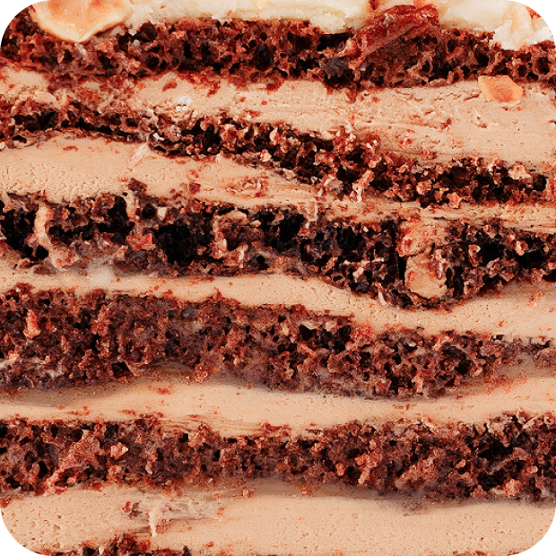 Шоколадный бисквит, крем из молочного шоколада с прослойкой карамели, фундук